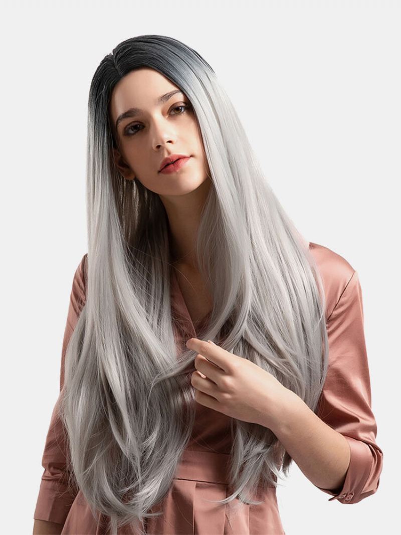 26palcové Syntetické Paruky Černé S Přechodem Šedé Elegantní Dlouhé Rovné Vlasy Pro Ženy