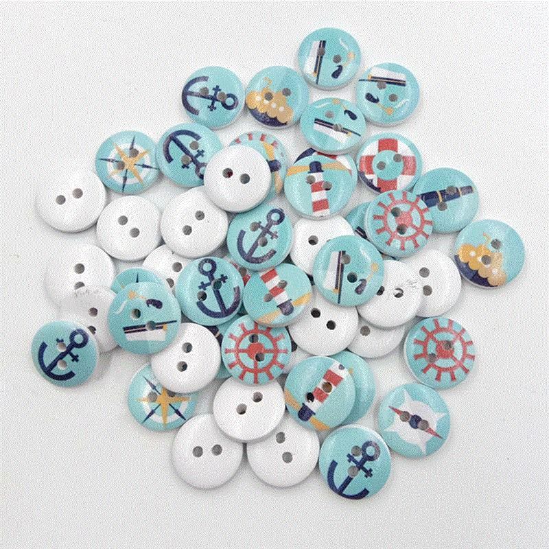 50 Ks 15mm Modrý Potisk V Námořnickém Stylu Dřevěné Knoflíky Diy Ruční Materiály