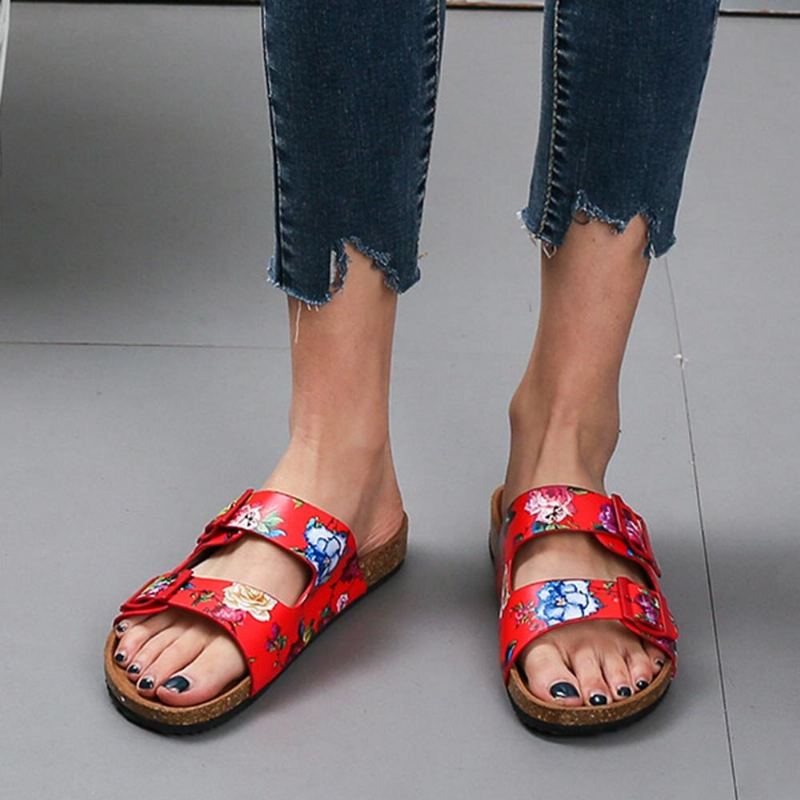 Dámské Pantofle S Dvojitou Sponou S Květinovým Vzorem Korková Stélka