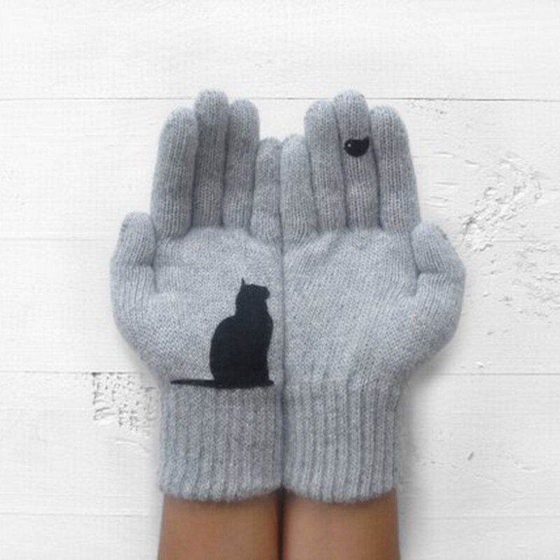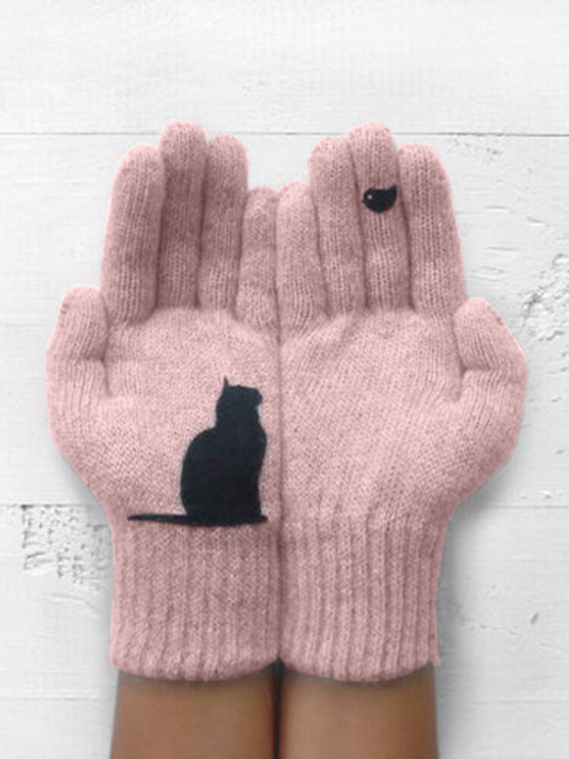 Dámské Vlněné Rukavice Podzim Zima Venkovní Teplé Studené Polstrované S Potiskem Kočky Bird