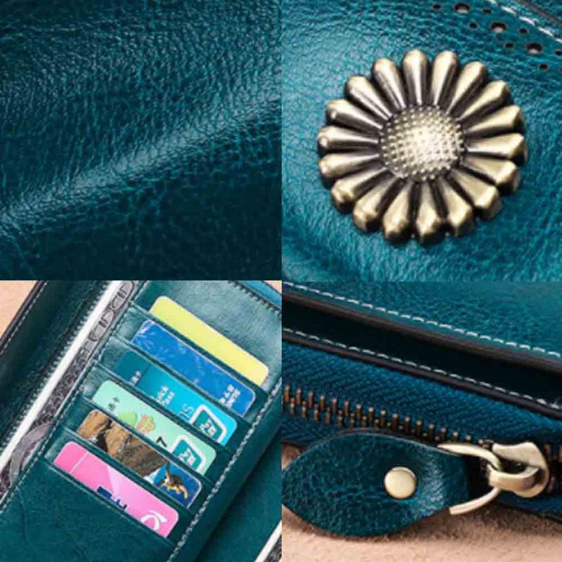 Klasická Slunečnicová Dámská Spojka Je Převzata Ve Vintage Stylu, Je Vyrobena Z Hovězí Kůže Olejového Vosku, Vestavěné Sloty Na Karty A Zipy Pro Výměnu Mezivrstvy A Dlouhé Pozice Na Hotovost, Dekor S Bronzovou Barvou Slunečnice, Flip -Typ Se Skrytou Sponou, Přenosný A Módní, Nabízí Pohodlí A Módu Při Používání, Dobrá Volba Pro Večerní Párty A Nakupování.