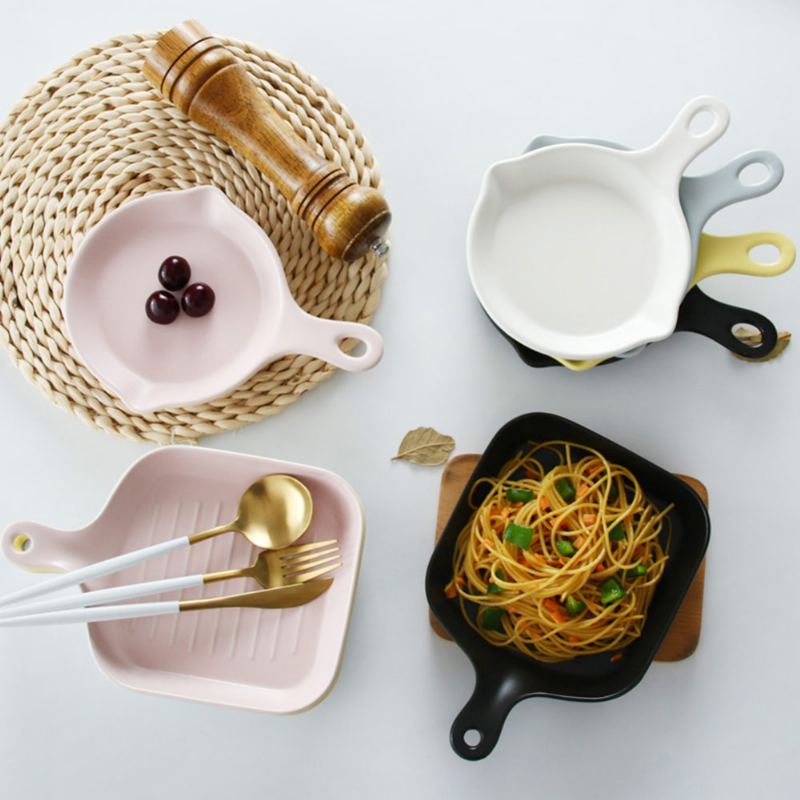 Minimalistický Kulatý Čtvercový Keramický Talíř Pro Domácnost S Rukojetí Klasický Matný Barevný Glazovaný Na Vkládání Potravin