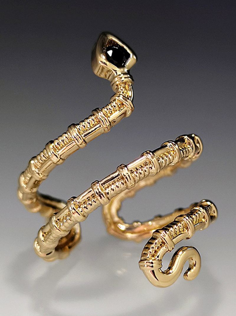 Vintage Vyřezávaný Vinutý Měděný Prsten Ve Tvaru Hada S Vykládaným Černým Zirkonem S Nastavitelným Otevíráním 18k Zlatem
